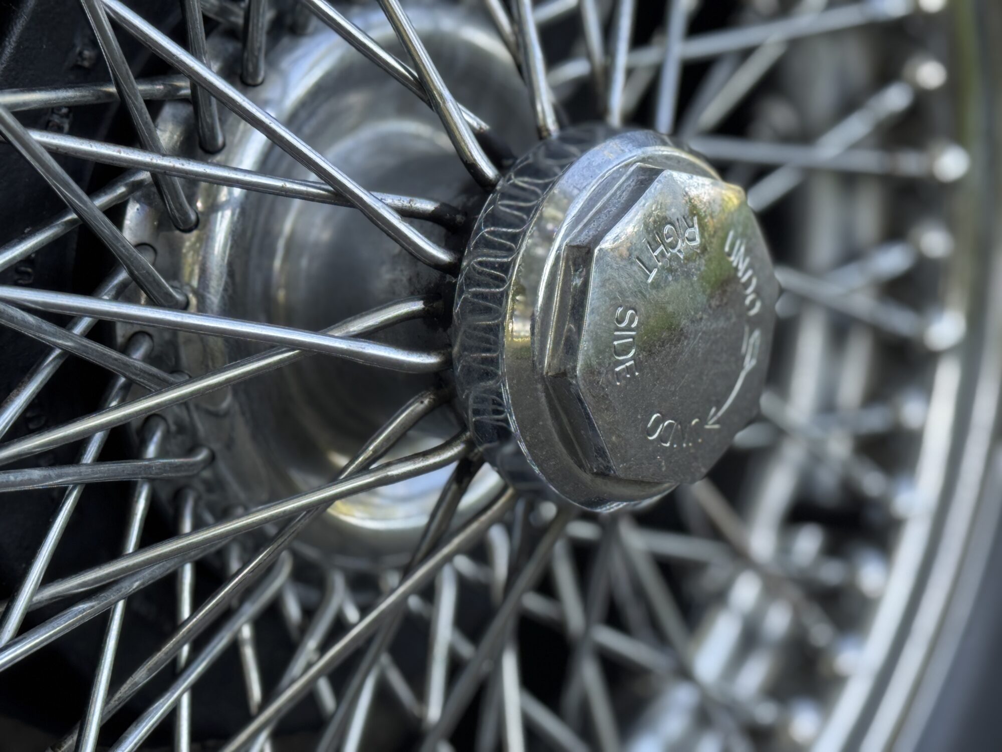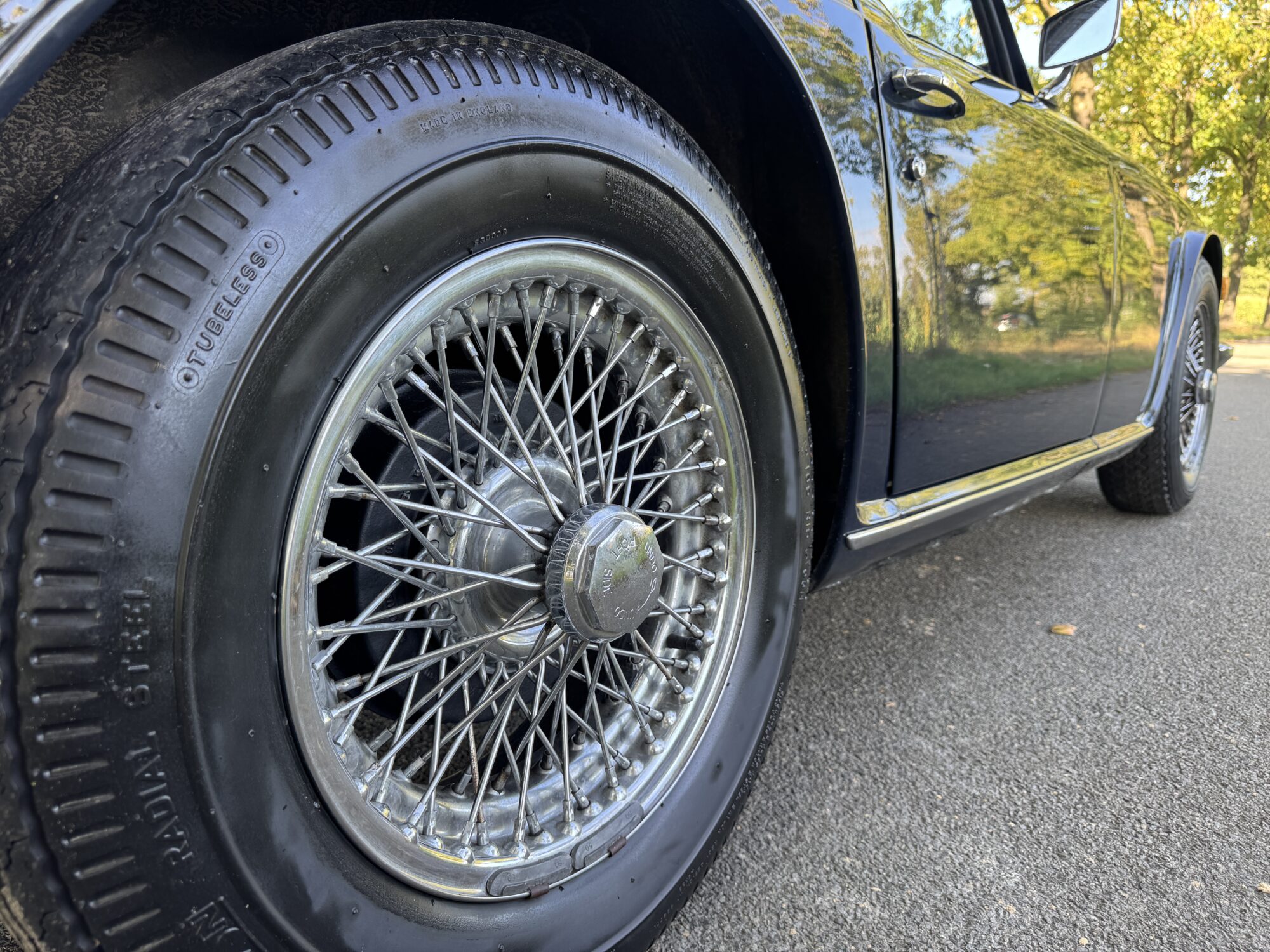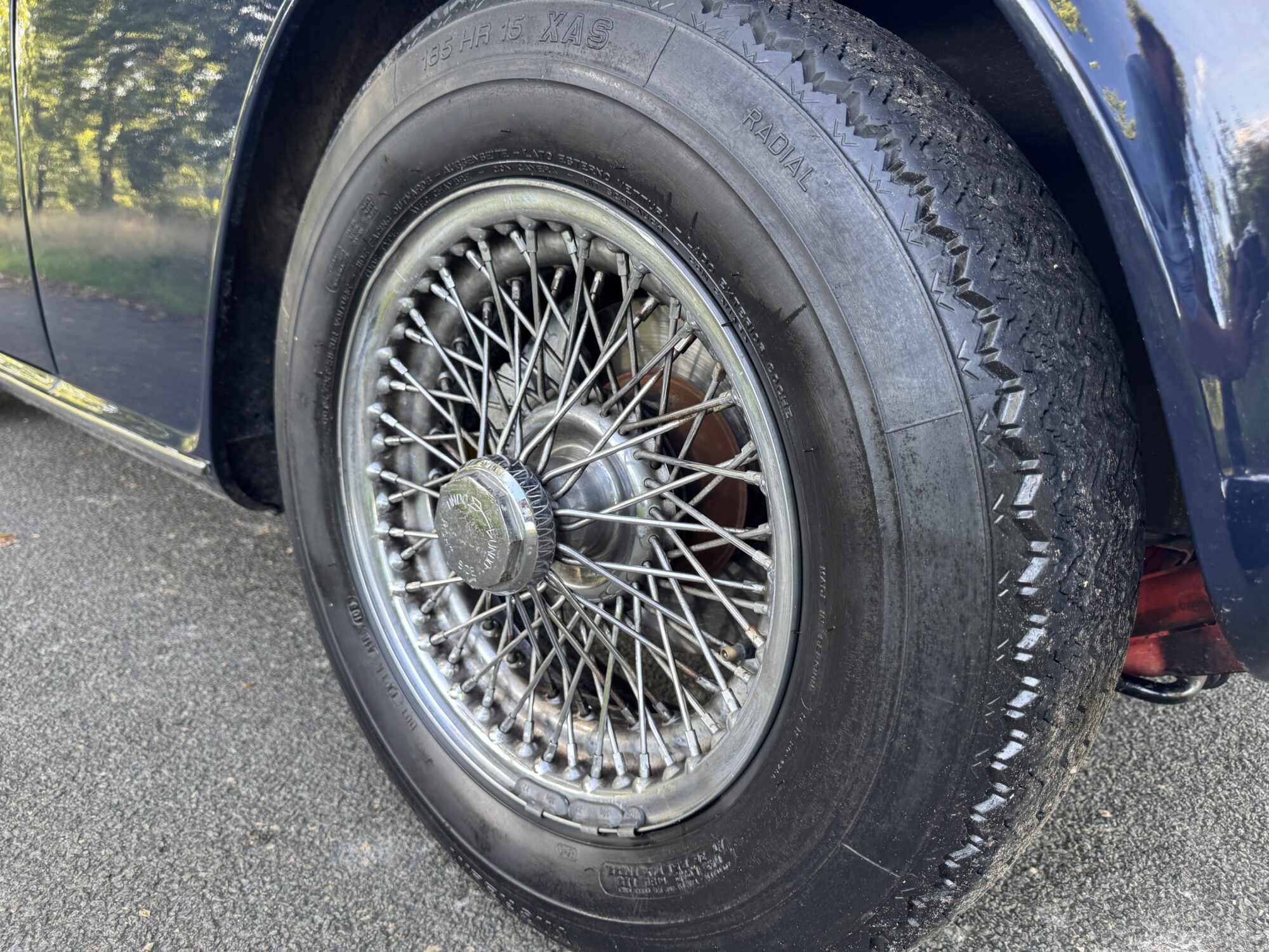 Het interieur beschikt over twee originele lederen stoelen met hoofdsteun, een noten dashboard met originele Smiths tellers, overdrive aan de pookknop, lederen handrem-hoes.